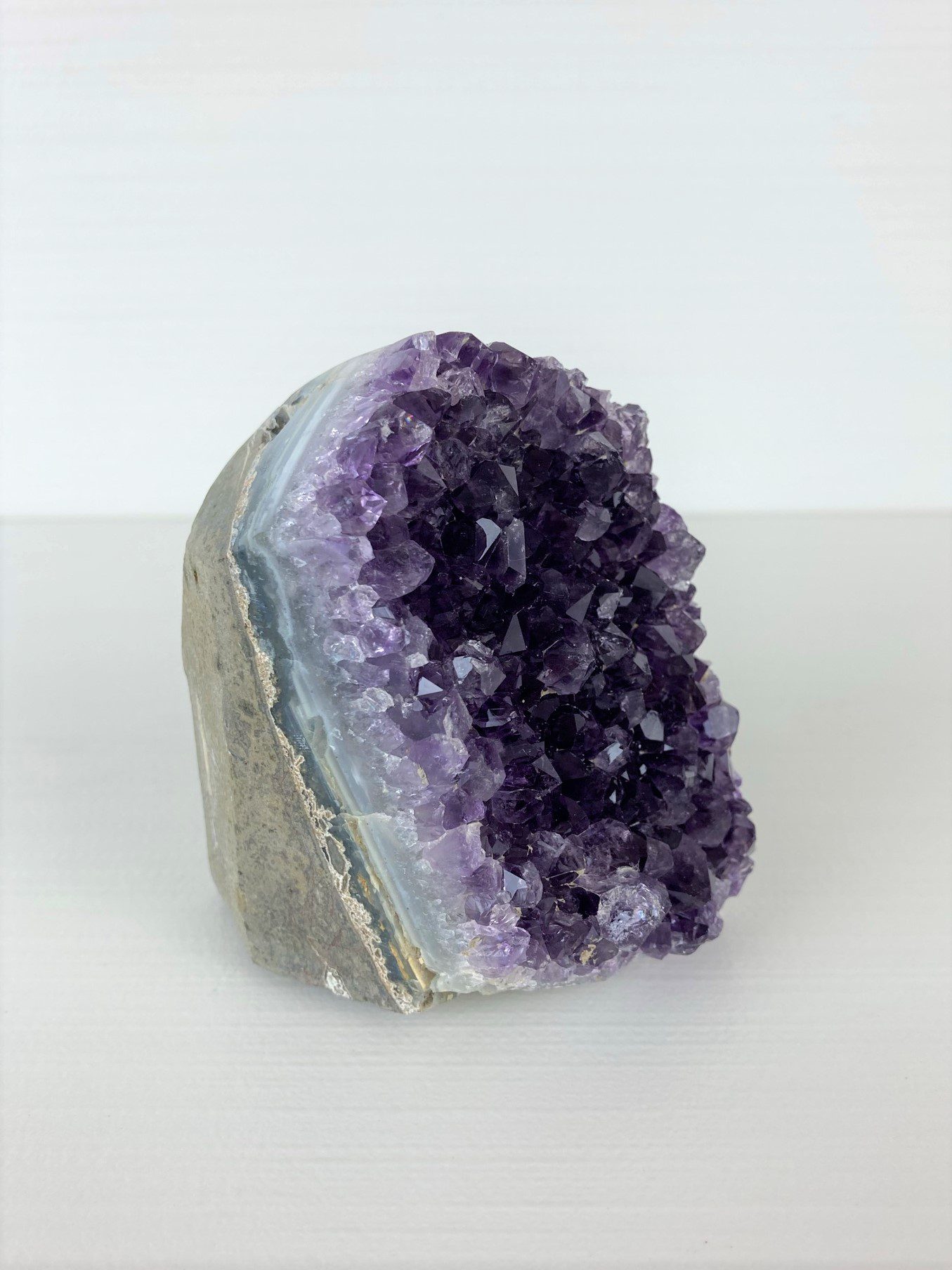 This Extra Grade Uruguayan cluster has some lovely polished sides, which show a lovely cross section of the stone where banded agate can be seen.  This deep purple cluster has a cut base and stands flat and there is some exposed rock to the back.  It measures about L4.5 x D5.75 x H6.5 and weighs 270g.